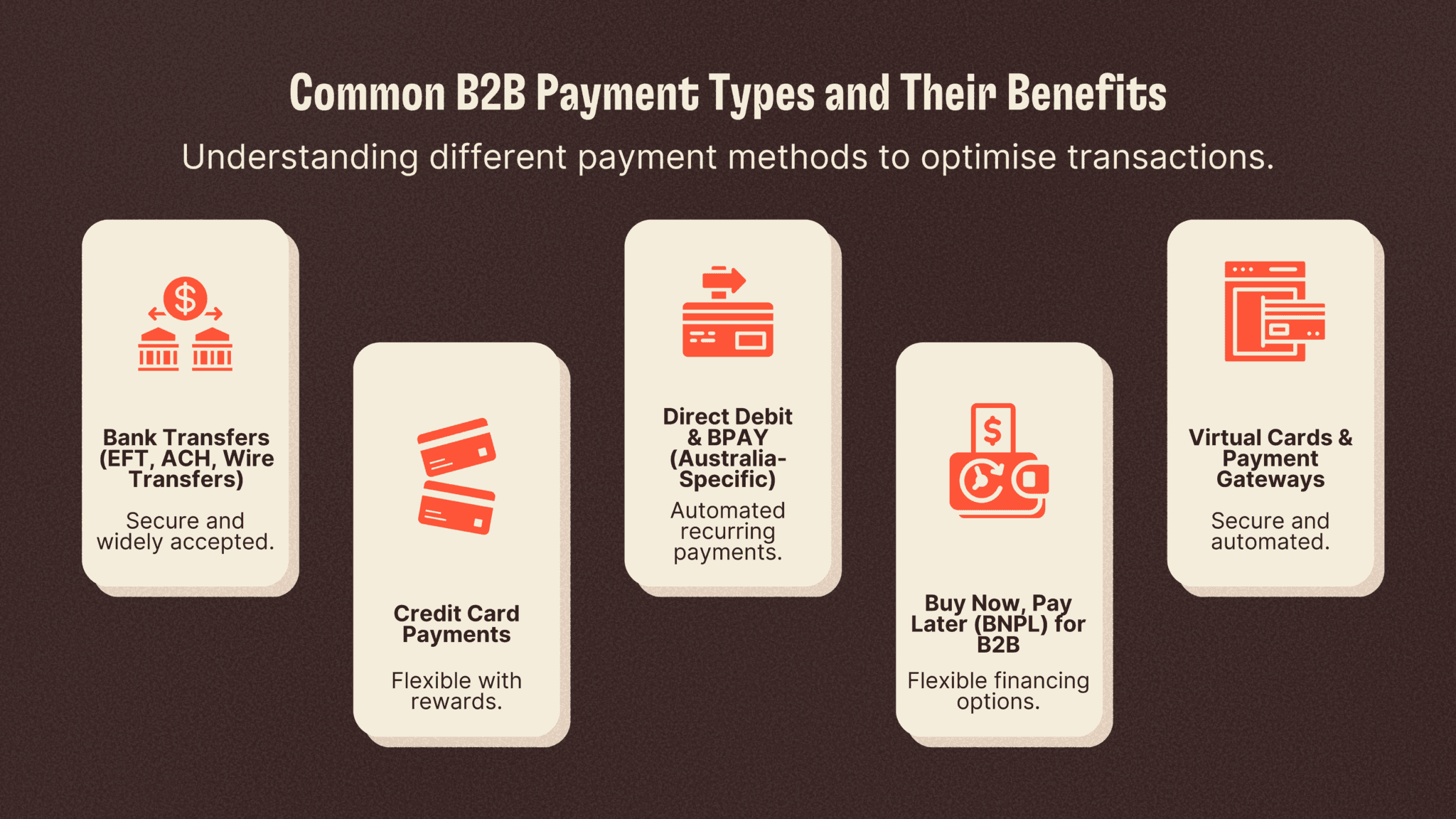 Businesses have multiple payment options, each with distinct advantages and considerations. Below is an overview of the most common B2B payment types.