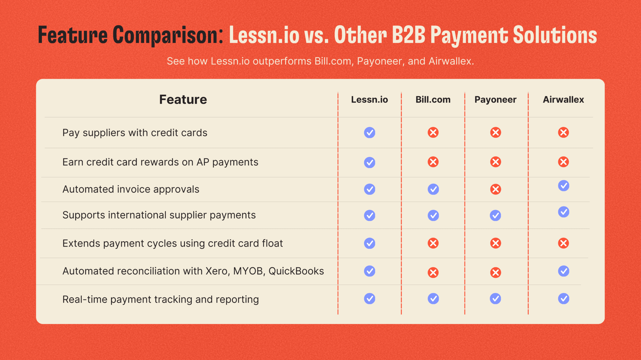 Here’s how Lessn.io outperforms competitors like Bill.com, Payoneer, and Airwallex in key areas:
