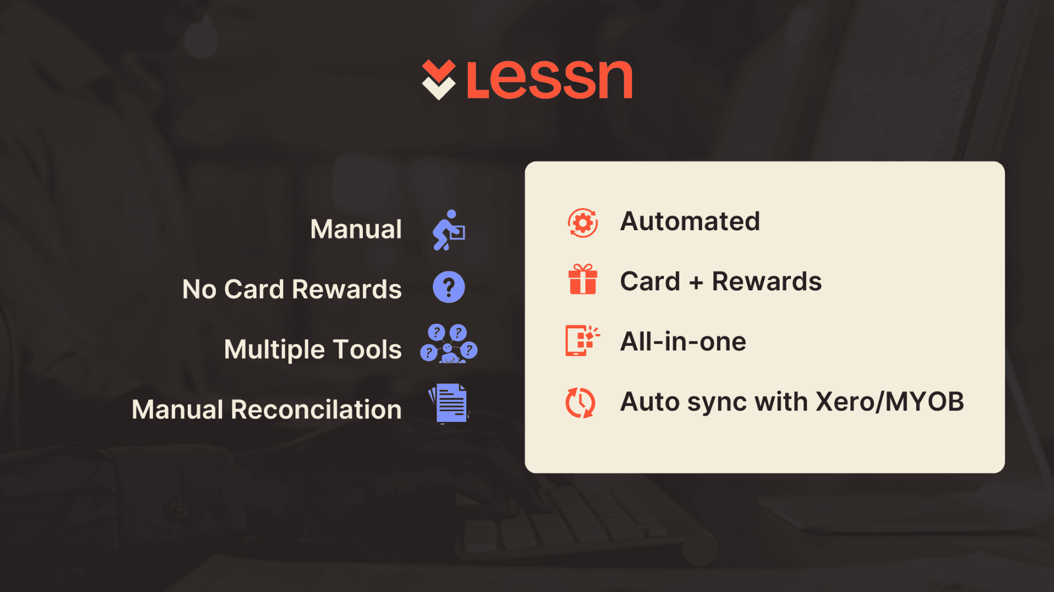 But what really sets Lessn apart is the ability to fund any payment via credit card, even if the supplier doesn’t accept cards. That means you can unlock rewards, preserve cash flow using your card’s interest-free period, and extend working capital, all without changing the way your supplier gets paid. They receive a normal bank transfer, while you get the financial flexibility and benefits.