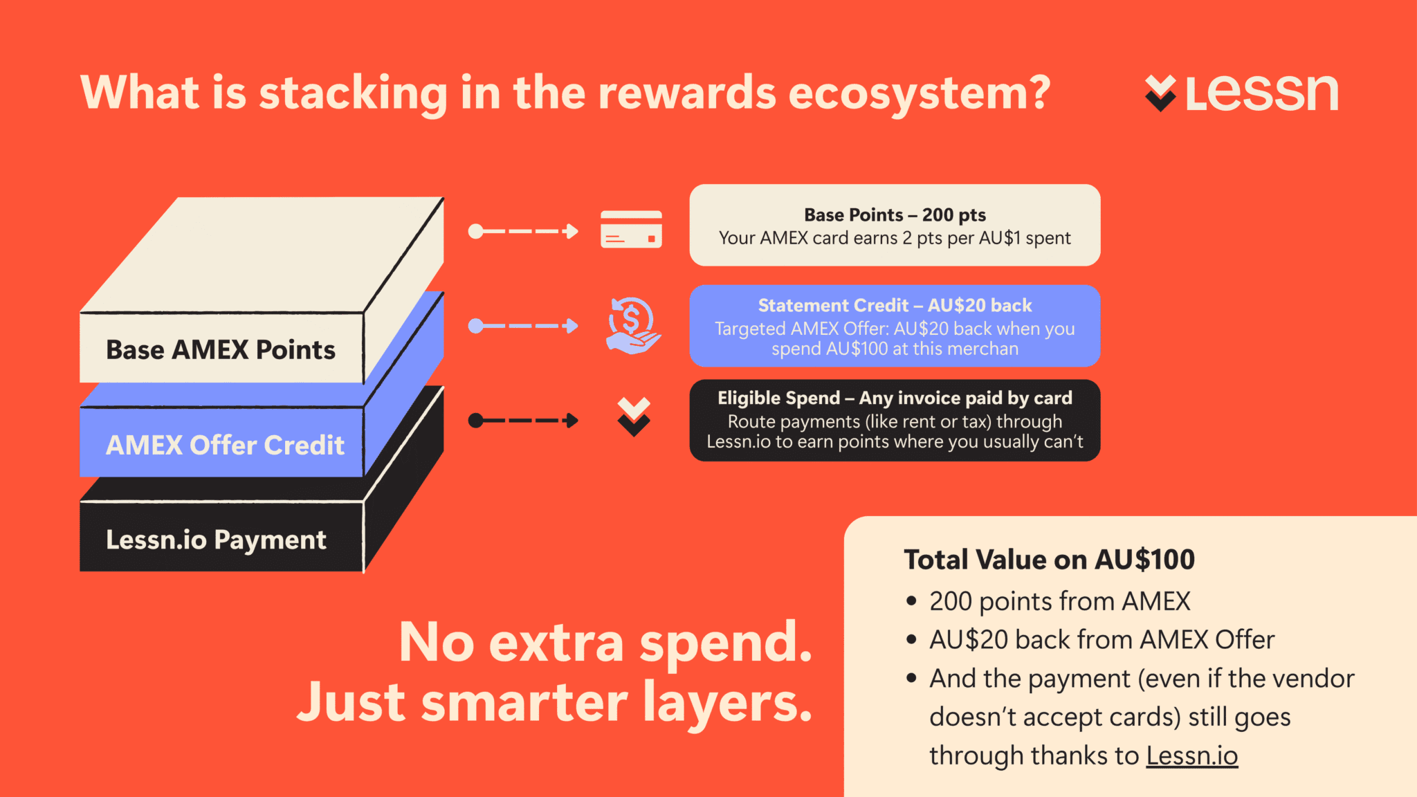 This guide will show you how to build a stacking strategy from the ground up. We’ll start by covering the core rewards layers—your base earn rate, welcome offers and merchant-specific deals. Then we’ll dig into shopping portals and referral credits. Finally, we’ll explain how Lessn.io lets you extend stacking to non-cardable expenses like rent, insurance and PAYG tax. Along the way you’ll find clear, step-by-step tactics and real-world examples so you can optimise every large payment.