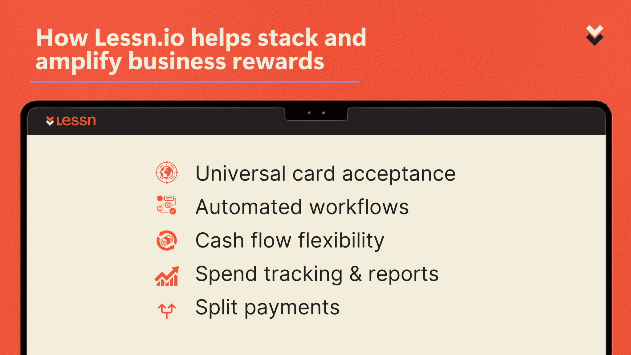 With Lessn.io, non-cardable spend finally joins your rewards strategy. Every rent, tax or payroll payment becomes a chance to earn more points, unlock new offers and free up working capital—all without asking your supplier to change a thing.