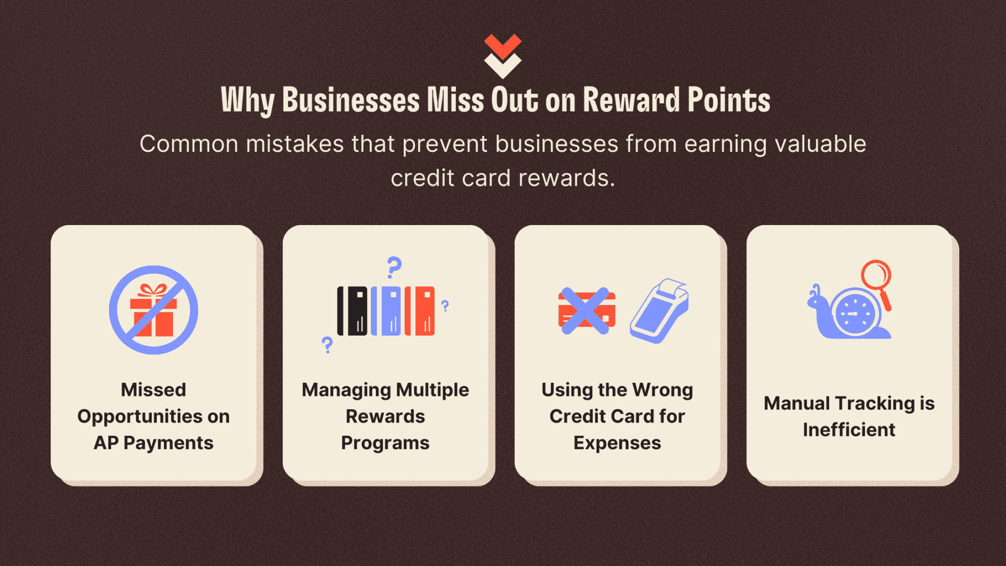 Different credit card providers offer varying reward structures, and businesses often find it difficult to track which expenses should go on which card. This leads to suboptimal rewards accumulation.