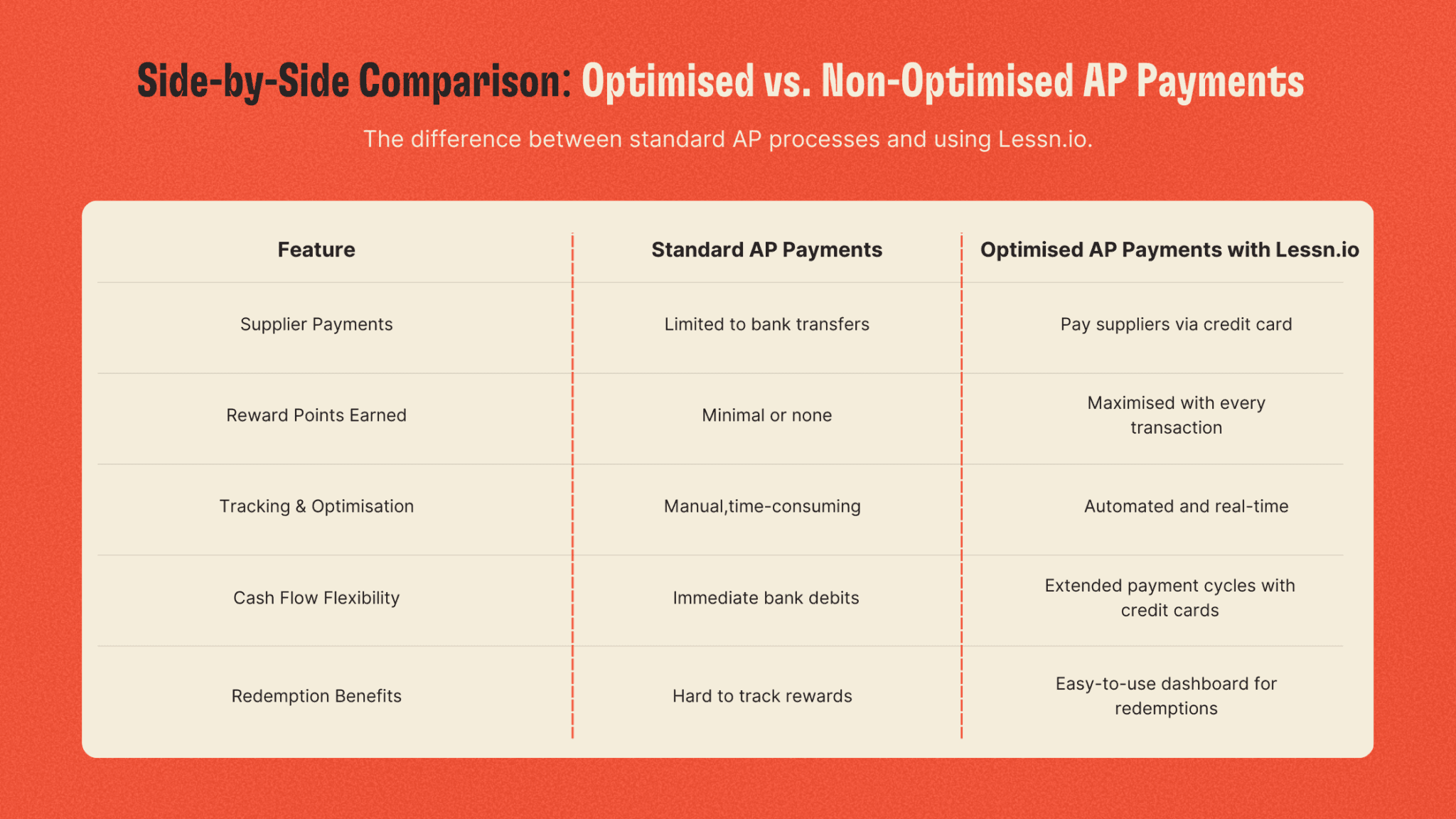 Many businesses treat supplier payments as a standard operating cost without realising the financial advantages that can come from optimising payment methods. With Lessn.io, every invoice becomes an opportunity to earn valuable credit card rewards, improve cash flow, and unlock financial benefits that can contribute to business growth.