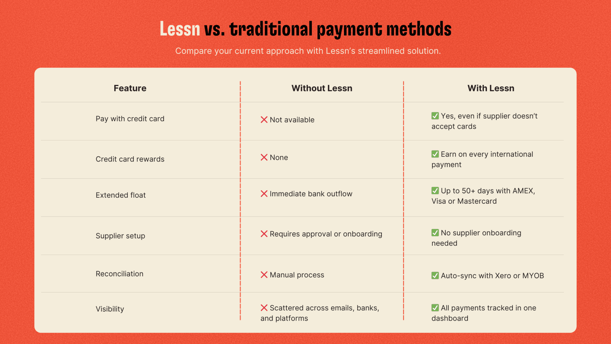 You’re often forced to pay upfront using your business account, with no option to use your AMEX, Visa or Mastercard, even if that would suit your cash flow strategy better. That means no float, no rewards, and no flexibility.