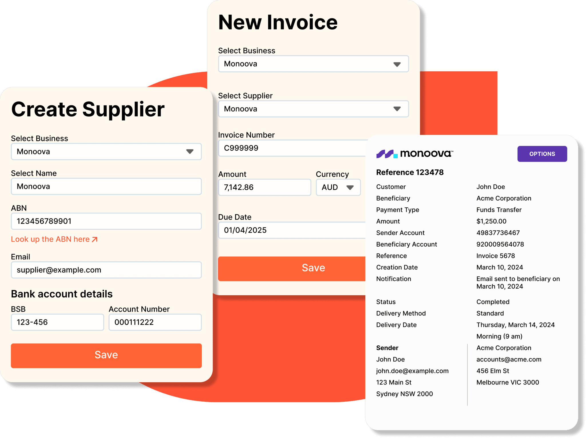 Monoova processes international transfers promptly. Settlement times depend on the destination country and the currency involved but are generally completed on the same or next business day. This ensures your suppliers get paid quickly while you maintain control over the timing and method of funding.