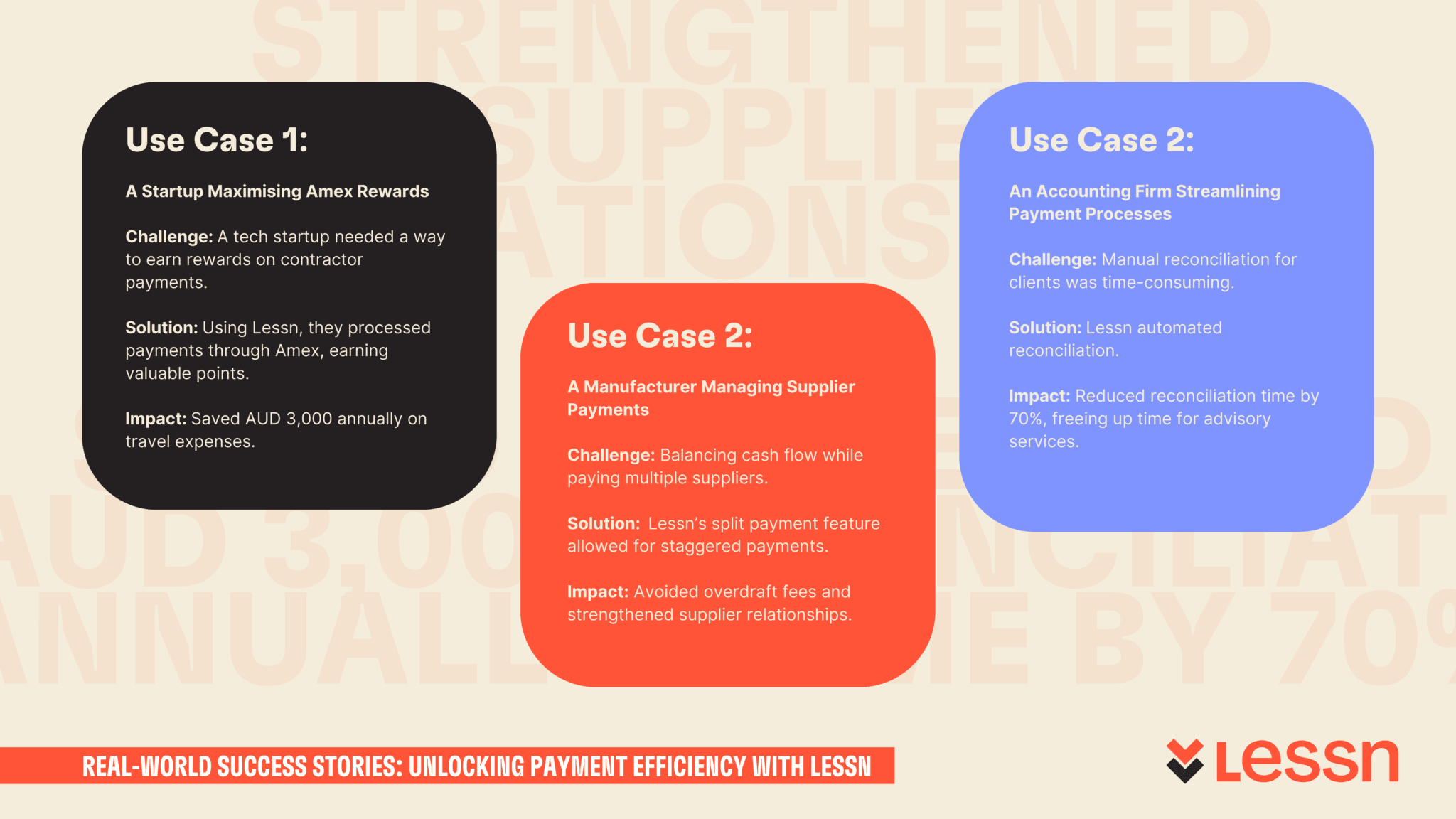 Case Study: A Sydney-based IT services firm earned over AUD 7,500 in Amex points annually by using Lessn for vendor payments, offsetting travel costs for client visits.